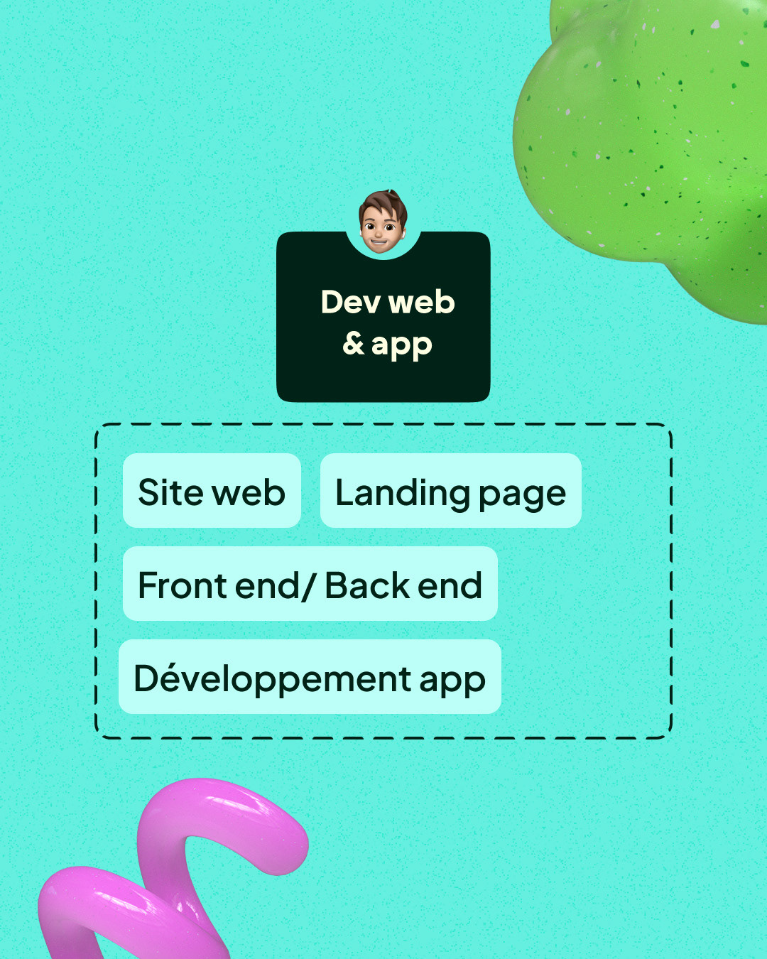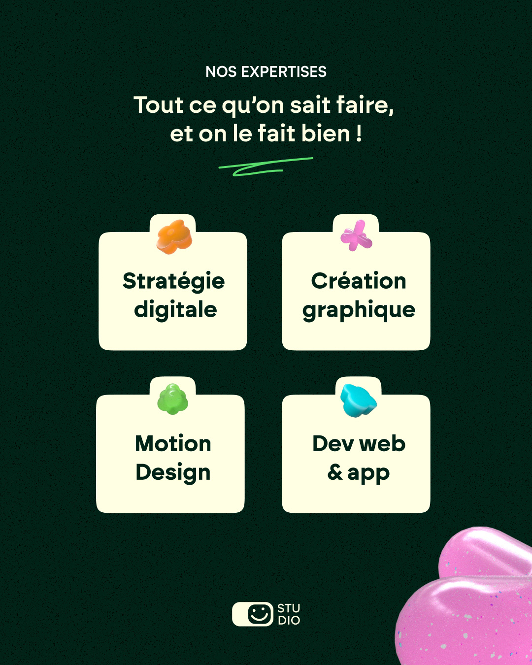 Création d'éléments 3D à la matières glossy et à aux teintes acidulées, incarnant l’énergie créative.